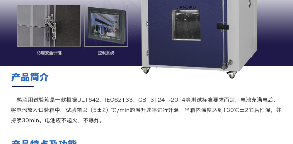 用途:熱濫用試驗箱是一款根據UL1642、IEC62133等測試標準要求而定,電池充滿電后,將電池放入試驗箱中。試驗箱以(5±2)℃/min的溫升速率進行升溫,當箱內溫度達到130℃±2℃后恒溫,并持續